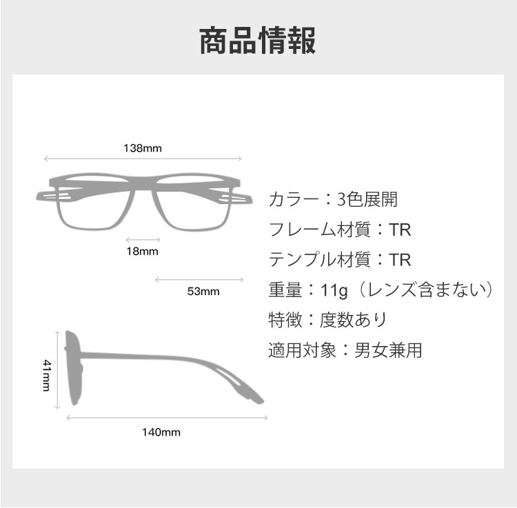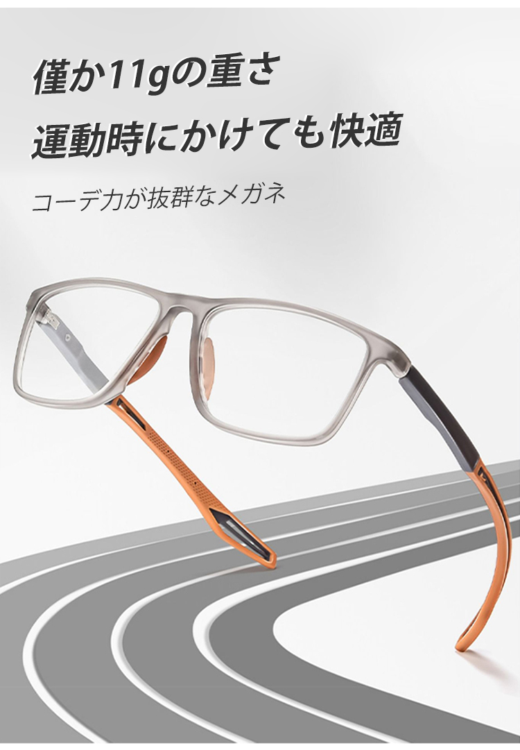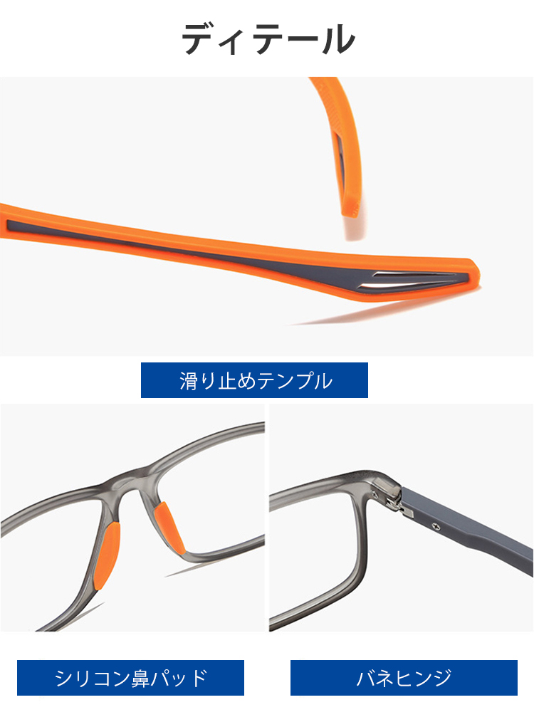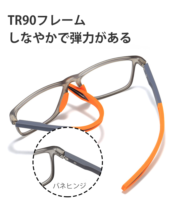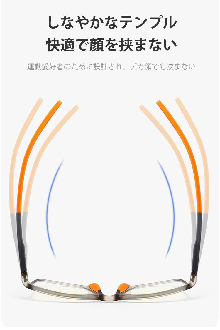 男女兼用、高透明度、軽量、ブルーライトカット、耐衝撃レンズ、しなやかなテンプル、顔を挟まない